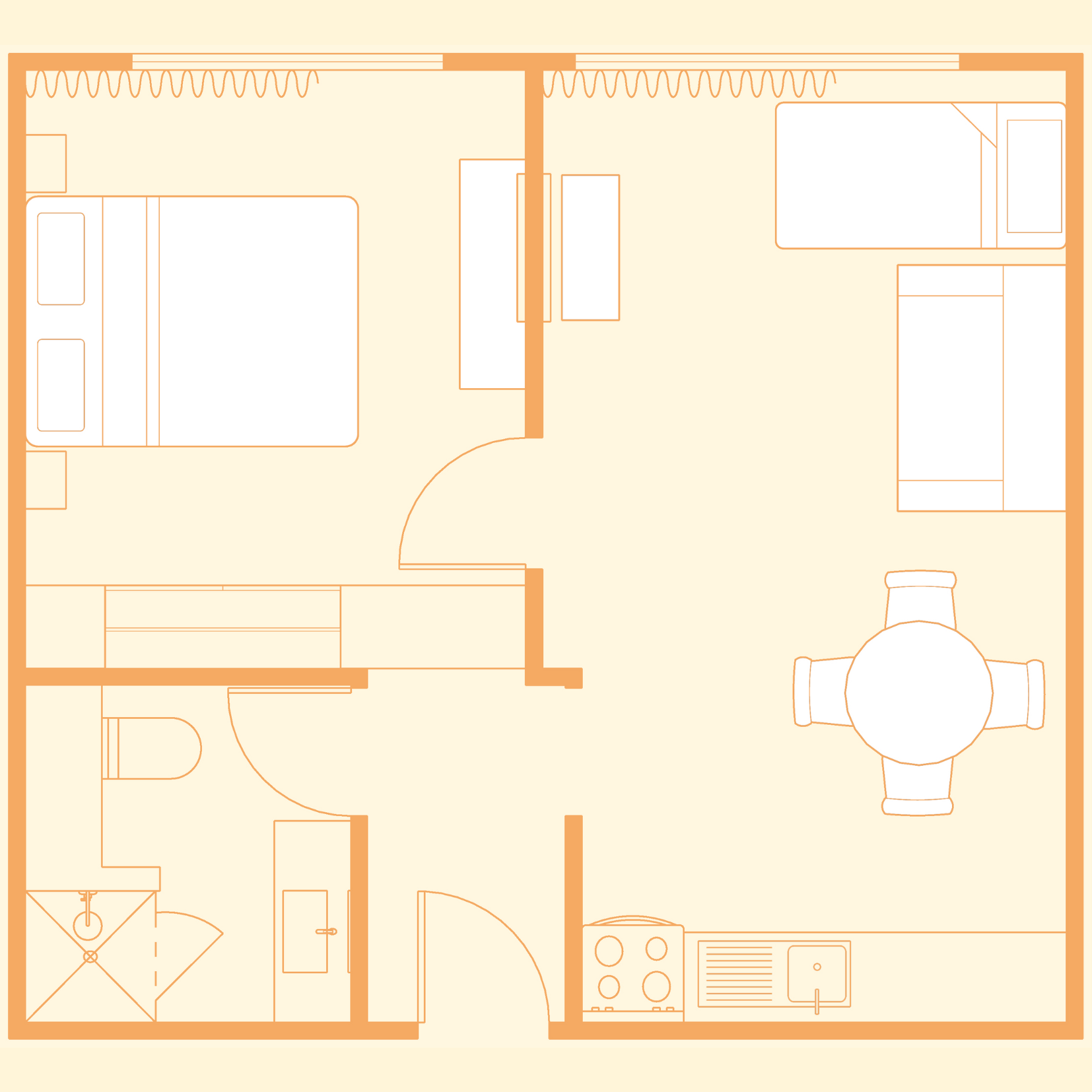 Spacious and stylish with a relaxed, retro-modern feel, this suite is perfect for couples or small families. It features a closable bedroom with a queen bed, a single bed in the lounge, and an optional fold-out sofa bed for extra guests. Available on both lower and upper levels, opening onto a shared garden or private balcony. Enjoy a fully equipped kitchen, dining area for four, heat pump, TV, sofa bed, blackout curtains, and a stylish bathroom for added comfort.
