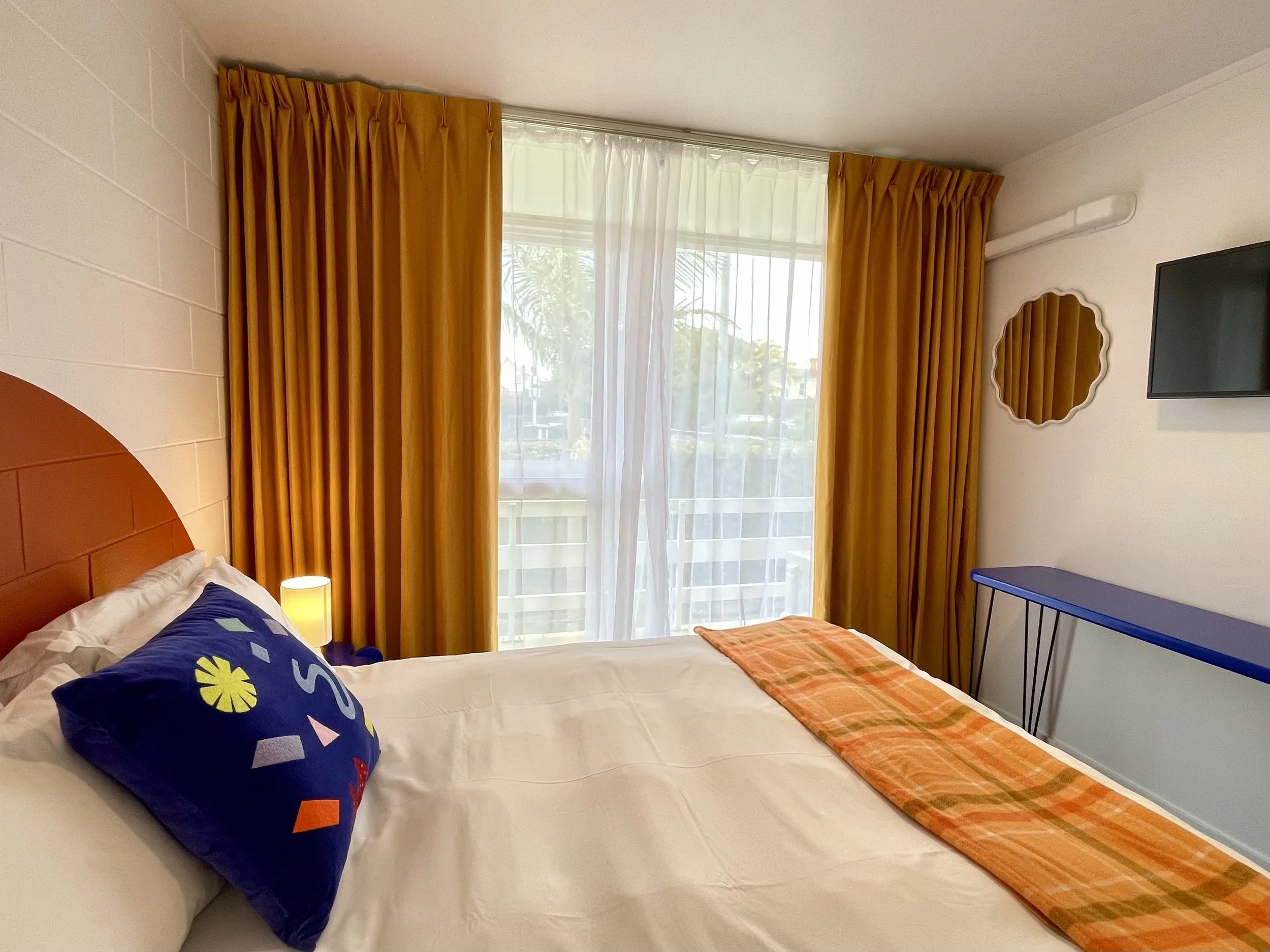 Freshly renovated and full of retro-modern charm, this spacious suite is ideal for couples or small groups wanting a little extra comfort. Each suite features a closable bedroom with a queen bed and a single bed in the lounge. Located on both lower and upper levels, some suites open to a shared garden while others include a private balcony. Enjoy a fully equipped kitchen with breakfast bar dining, heat pump, TV, sofa, blackout curtains, and a stylish bathroom for a relaxed and comfortable stay.
