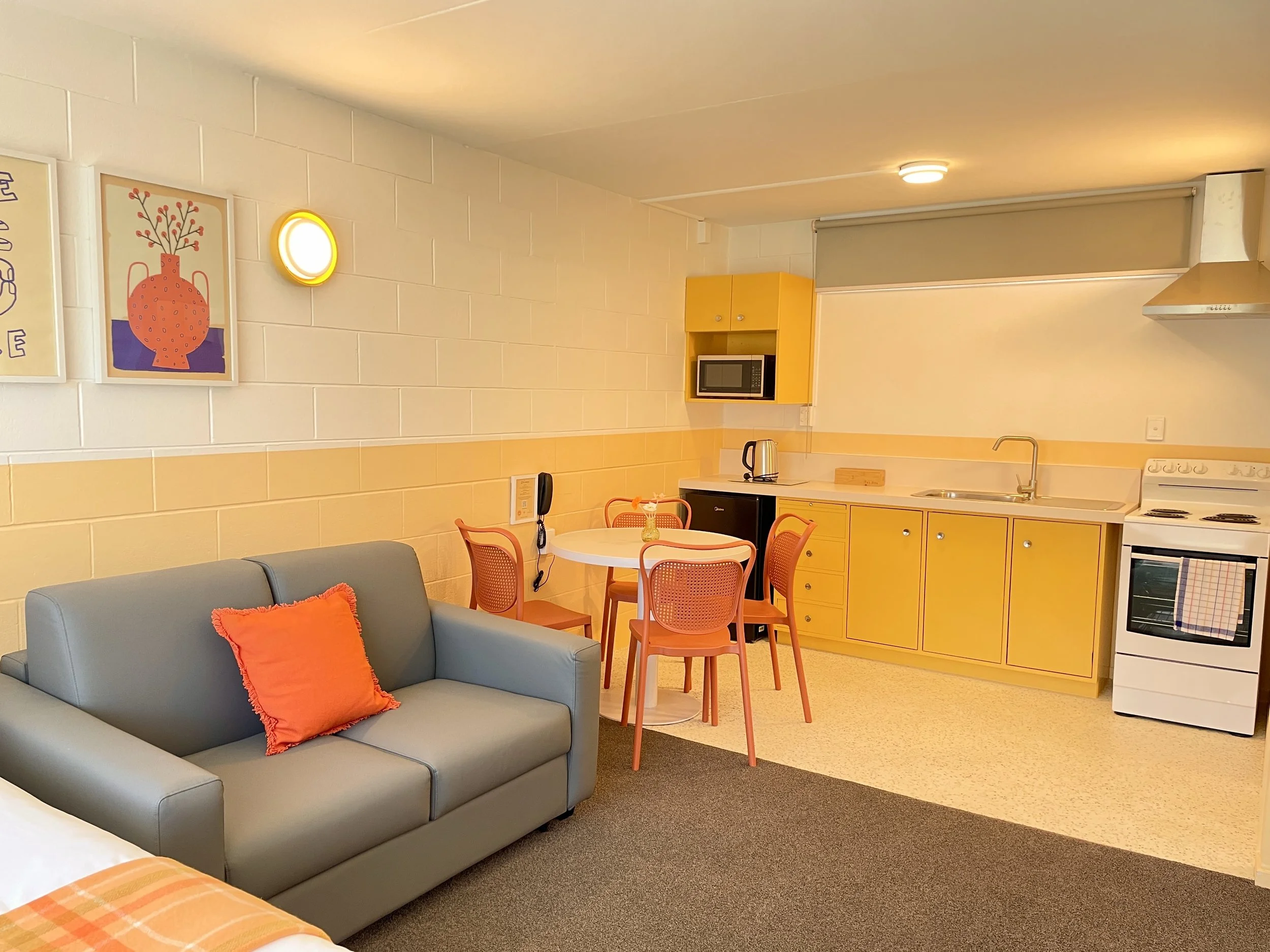 Spacious and stylish with a relaxed, retro-modern feel, this suite is perfect for couples or small families. It features a closable bedroom with a queen bed, a single bed in the lounge, and an optional fold-out sofa bed for extra guests. Located on the upper level, each suite includes a private balcony with a view. Enjoy a fully equipped kitchen, dining area for four, heat pump, TV, sofa bed, blackout curtains, and a stylish bathroom for added comfort.